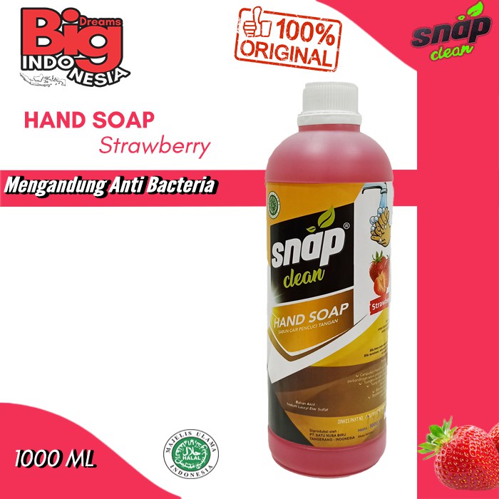 PRODUK SELALU READY, LANGSUNG AJA DIORDER KAKA :DPENTING!INFO JAM PENGIRIMAN :INSTAN SAMPAI JAM 4 SORESAMEDAY SAMPAI JAM 3 SOREPENGIRIMAN SENIN SAMPAI SABTU (MINGGU / TANGGAL MERAH LIBUR)[Peraturan Order]Dikarenakan peraturan order pihak layanan online delivery GOJEK DAN GRAB yang melakukan pembatasan berat dan ukuran pada setiap pengiriman maka kami PIHAK SELLER hanya bisa melakukan pengiriman sebagai berikut :Gojek dan Grab Layanan Instant Delivery : Maksimal 18 Galon .Gojek dan Grab Layanan Sameday Delivery : Maksimal 6 Galon.Bila pesanan melebihi Peraturan Order diatas kami akan tetap mengirimkan pesanan pembeli dengan batas maksimal dan sisa uang pembeli akan di kembalikan. Terima Kasih[Deksripsi Produk]HANDSOAP SNAP CLEANHand Soap adalah sabun cair khusus untuk mencuci tangan, terbuat dari bahan selulosa, an-ionic surfactant dan wewangian alami. Bersih, lembut, wangi dan aman bagi kulit.Cairan kental yang di pakai untuk mencuci tangan. Sangat praktis membersihkan kotoran, dan meninggalkan wangi segar pada tangan, lembut dan aman untuk kulit tangan.Sertifikasi :1. IJIN DINKES PKRT NO : 440/001-SPKRT/DPMTSP/0L/20182. MSDS (Sertifikat Keselamatan)3. Halal4. SUCOFINDOSpesifikasi :1. 1 Liter / GALON2. Tersedia Varian Strawberry, Lemon dan Lav