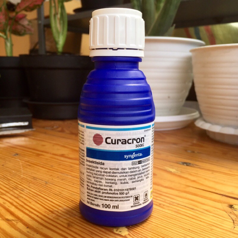 CURACRON 500EC 100mL Insektisida Kutu Daun Lalat Buah Ulat Grayak Thrips Penggerek Batang Buah dllSpesifikasi Curacron Kemasan 100 ml :Bahan aktif : Profenofos 500g/lFormulasi : EC (Emulsible Concentrate)/cairan pekatWarna : Kuning kecoklatanCara Kerja : Kontak &LambungCuracron 500EC merupakan insektisida multi fungsi, dpt digunakan utk mengendalikan hampir semua jenis hama pd tanaman. Bekerja secara kontak & lambung sehingga sangat efektif utk mengendalikan hama dgn cepat. Curacron 500EC dpt digunakan utk membasmi hama antara lain ; kutu daun, ulat grayak, ulat tanah, lalat buah, jangkrik, penggerek daun, penggerek batang, penggerek buah & trhips. Curacron 500EC dgn efek translaminarnya mampu menjangkau hama yg ada dibalik daunDosis & Cara Penggunaan:Bawang merah : ulat grayak Spodoptera exigua (Penyemprotan volume tinggi : 1,25 - 1,5 ml/l)Cabai : hama Thrips sp. (Penyemprotan volume tinggi : 0,5 - 1 ml/l)Jeruk : kutu loncat Diaphorina citri (Penyemprotan volume tinggi : 0,5 - 1 ml/l)Kacang hijau : ulat grayak Spodoptera litura, perusak daun Plusia chalcites (Penyemprotan volume tinggi: 1 - 2 ml/l)Kentang : penggerek ubi Phtorimaea operculella, Thrips sp. (Penyemprotan volume tinggi : 2 ml/l)Kubis : perusak daun Plutella xylostella. ulat krop Crocidolomia pavonana (Penyemprotan volume tinggi : 1,5