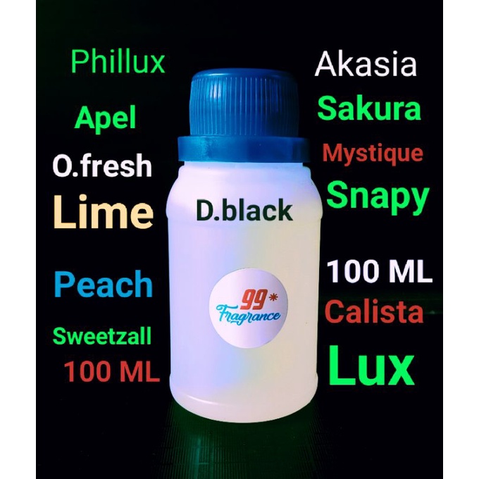 Bibit parfume laundry 100ml.Garansi.Farian Aroma:ApelAnggurAkasiaBubble gumBlack phillisBlack coffeeCuddleCalistaCrantberryDonii pinkDonii passionDonii purpleDonii mystiqueGreen teaJeruk orangeJambuKopi baliKopi blackLuxLimeLemonMelonMaura (maxla)Molt pinkMolt blueOcean freshPeachPhilluxSnapySirsak SugusSakura blossom(soft)Sakura freshSweetzall babyStrawberryVanillaDll