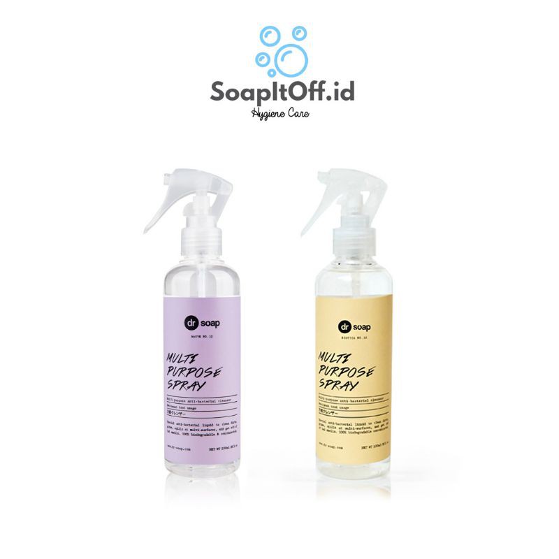 dr soap Multi-Purpose Spray adalah cairan anti-bakteri khusus untuk membersihkan kotoran, debu, dan tumpahan di segala permukaan. Membunuh kuman tanpa bahan kimia berbahaya bagi keluarga Anda dan menyingkirkan bau tidak sedap. Menyegarkan ruangan dengan aroma mauve dan biotyca. Dibuat dengan formula yang ramah lingkungan dan melalui proses yang sempurna. 100% konsentrat biodegradable. Produk kami benar-benar bebas dari paraben dan tidak pernah diuji coba pada hewan. Dapat digunakan untuk menghilangkan bau di jok mobil, ruangan, bekas ompol/muntah, sepatu, helm, bantal, tirai, handuk, matras, karpet, sofa, peralatan olahraga, mainan, lemari sepatu, dan lain-lain.dr soap Multi-Purpose Spray:- Cairan anti-bakteri.- Khusus untuk membersihkan kotoran, debu, dan tumpahan di segala permukaan.- Membunuh kuman tanpa bahan kimia berbahaya bagi keluarga Anda dan menyingkirkan bau tidak sedap.- Menyegarkan ruangan dengan aroma mauve (floral) dan biotyca (citrus fresh)-Ramah lingkungan.Cara penggunaan : Cukup semprot dr soap Multi-Purpose Spray ke permukaan yang bau dan kotor. Kemudian, gunakan kain bersih untuk menggosok sampai bersih (untuk pengujian, gunakan di sudut permukaan terlebih dahulu).Scent: Mauve & Bio