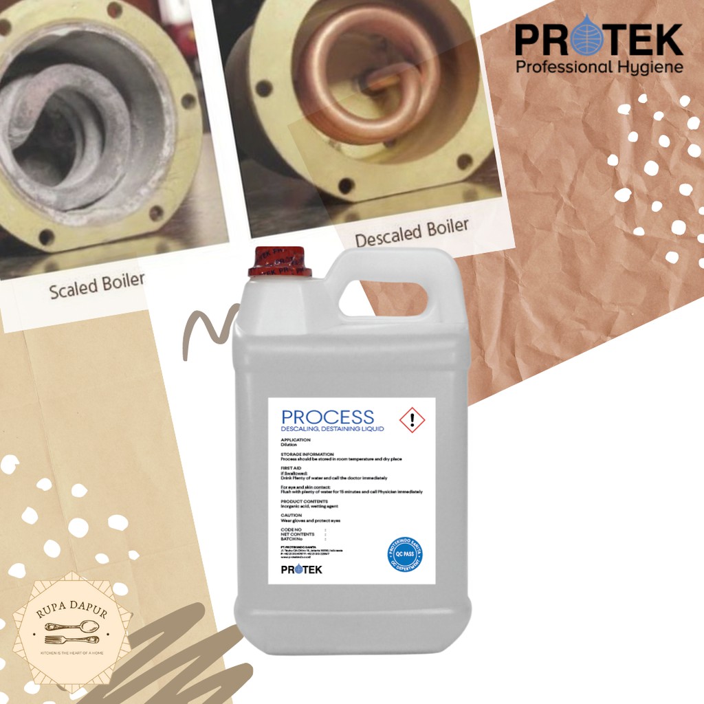 Process - cairan pembersih kerak air pada Boiler dan lainnya.Harga untuk 1 jerigen berisi 5 liter.Spesifikasi produk:1. Diproduksi oleh PT. Protekindo Sanita.2. Digunakan untuk membersihkan kerak air yang menempel pada boiler, sink, dan alat2 yang terbuat dari stainless steel lainnya.3. Penggunaan #1: campurkan 25ml Process dengan 1 liter air, kemudian semprotkan pada bagian yang hendak dibersihkan.4. Penggunaan #2: campurkan 500ml Process dengan 1 liter air, kemudian rendam alat-alat yang hendak dibersi