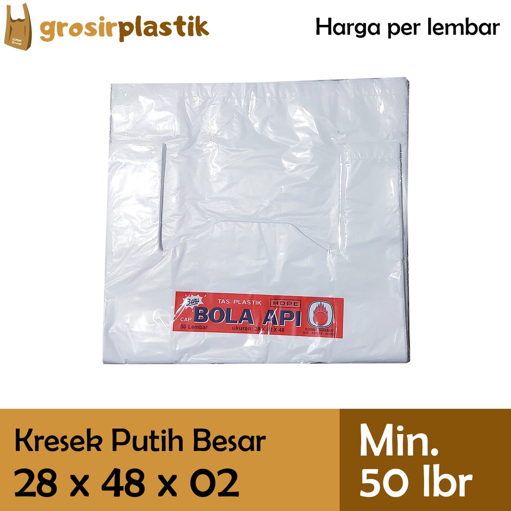 *Harga PER LEMBAR, Bukan Harga Per Pack Atau Per Ikat.*Harga PER LEMBAR, Bukan Harga Per Pack Atau Per Ikat.Minimal pembelian 50 lembar (1 pack = 50 lembar), berlaku kelipatan (misal pembelian 2 pack = 100 lembar)*Barang READY STOCK, Silakan Langsung Diorder.*Bukan Reseller / Dropshipper.*Bisa COD / GOJEK / GRAB Via Marketplace.*GOJEK / GRAB: Sebelum Jam 16 (Senin-Jumat) Dan Sebelum Jam 15 (Sabtu) Langsung Kirim Hari Sama.*Pengiriman Ekspedisi Setiap Hari Ada (KECUALI Minggu/Tgl Merah)*TERSEDIA PENGIRIMAN VIA CARGO (Hubungi Kami)Merk: BOLA APIPanjang: 48 cmLebar: 28 cmKetebalan: 02Warna: PutihIsi per bungkus: 50 lembar*Tersedia harga khusus Grosir dan Bal/Karung.*Tersedia Warna / Ukuran / Ketebalan / Merk Kantong Plastik Kresek lainnya di etalase toko kami.*Jadwal Pengiriman dan Ekspedisi ""Instant/Same Day Delivery"" dapat dilihat di Catatan Toko.Untuk keterangan lebih lanjut dapat menghubungi kami.#GrosirPlastik #BolaApi #Sunrise #TasKresek #Grosir #Kantong #Kresek #Plastik #
