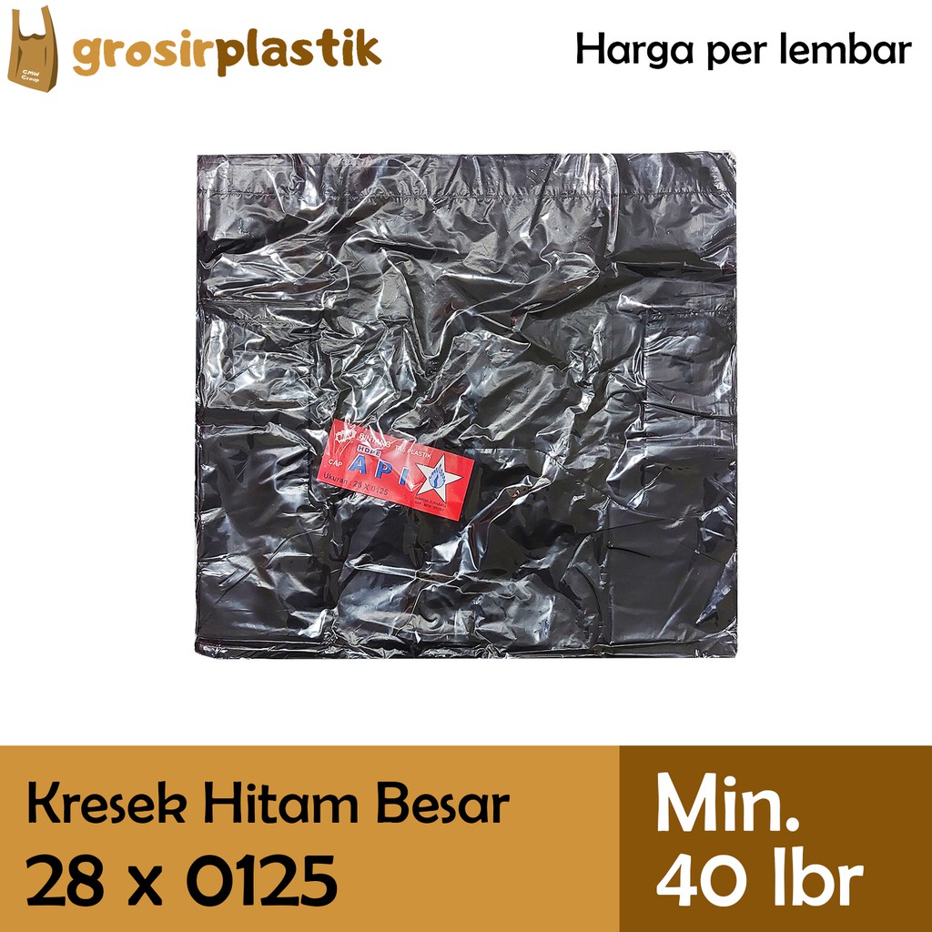 *Harga PER LEMBAR, Bukan Harga Per Pack Atau Per Ikat.*Harga PER LEMBAR, Bukan Harga Per Pack Atau Per Ikat.Minimal pembelian 40 lembar (1 pack = 40 lembar), berlaku kelipatan (misal pembelian 2 pack = 80 lembar)*Barang READY STOCK, Silakan Langsung Diorder.*Bukan Reseller / Dropshipper.*Bisa COD / GOJEK / GRAB Via Marketplace.*GOJEK / GRAB: Sebelum Jam 16 (Senin-Jumat) Dan Sebelum Jam 15 (Sabtu) Langsung Kirim Hari Sama.*Pengiriman Ekspedisi Setiap Hari Ada (KECUALI Minggu/Tgl Merah)*TERSEDIA PENGIRIMAN VIA CARGO (Hubungi Kami)Merk: BINTANG API MERAH (BAM)Panjang: +-45 cmLebar: 28 cmKetebalan: 0125Warna: HitamIsi per bungkus: 40 lembar*Tersedia harga khusus Grosir dan Bal/Karung.*Tersedia Warna / Ukuran / Ketebalan / Merk Kantong Plastik Kresek lainnya di etalase toko kami.*Jadwal Pengiriman dan Ekspedisi ""Instant/Same Day Delivery"" dapat dilihat di Catatan Toko.Untuk keterangan lebih lanjut dapat menghubungi kami.#GrosirPlastik #BintangApiMerah #BAM #Sunrise #TasKresek #Grosir #Kantong #Kresek #Plastik #