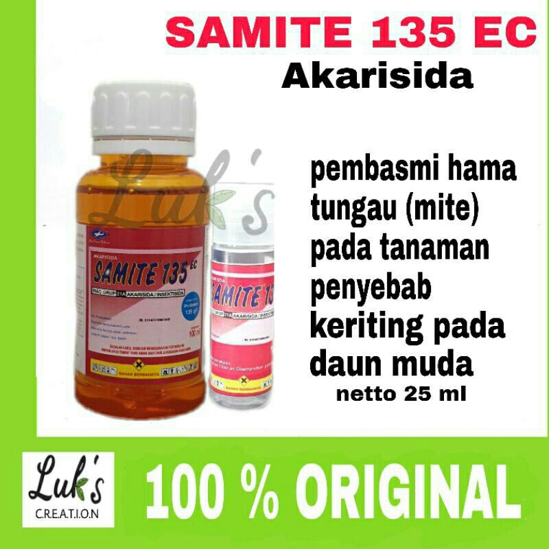 kemasan repack 25 ml sangat pas untuk kebutuhan skala rumahan.Salah satu Penyebab daun keriting pada tanaman adalah bukan hanya Kutu Putih, salah satunya adalah tungau.Hama tungau (Mite) ini hampir tidak kasat mata seperti kutu putih, biasanya hama tungau ini menyerang daun muda dan menghisap klorofil tanaman sehingga menghambat pertumbuhan tanaman, ciri tanaman terserang hama tungau adalah daun yang keriting dan jika di balik bawah daun terlihat emas kecoklatan.SAMITE 135EC, adalah akarisida racun kontak berbentuk pekatan yang dapat diemulsikan berwarna kuning terang, digunakan untuk mengendalikan hama tungau pada pertanaman IDENTIFIKASI PRODUK :- Nama Produk : SAMITE 135EC- Bahan Aktif : Piridaben 135 g/l- Jenis produk : Akarisida- Nama kimia : 2-tert-butyl-5(4-tertbutylbenzen-ylthio)-4-chloropyridazin-3(2H)-one- Rumus empiris : C 19 H25 Cl
