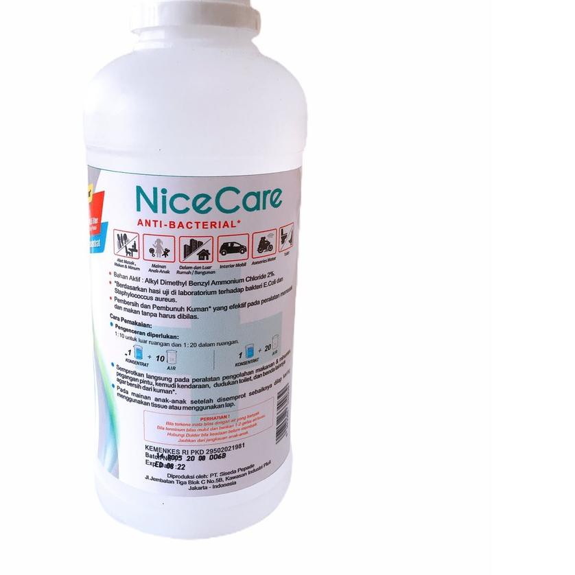Sebelum Order, Mohon untuk membaca dulu ya, karena kami tidak ingin mengecewakan costumer kami. Selama barang masih terpajang berarti stock barang tersebut ready, jadi dapat di order lansung. Untuk pemesanan jika ada pilihan warna dimohon untuk menuliskan keterangan warna dan opsi jika warna kosong atau (Hubungi CS). Terima KasihDISINFEKTAN "FOOD GRADE"PERHATIAN*Tersedia 2 Varian :1. Disinfektan Konsentrat ( Perlu Pencampuran Air )2. Disinfektan Siap Pakai Izin Kemenkes RI : Pengiriman sudah Termasuk Packing Kardus + Bubble Wrap ( jabodetabek hanya pagking kardus )Ingredients Nice Care Disinfektan : - Alkyl - Dimethyl - Benzyl - Ammonium Chloride 2%Cara Pemakaian :Pengenceran diperlukan :1. 1 Liter Konsentrat ( Disinfektan ) : 10 Liter Air > Untuk Luar Ruangan ( TOTAL : 11 LITER SIAP PAKAI ) 1 Liter Konsentrat ( Disinfektan ) : 20 Liter Air > Untuk Dalam Ruangan ( TOTAL : 21 LITER SIAP PAKAI )3. Pada mainan anak-anak setelah disemprotkan sebaiknya dilap kering menggunakan tissue atau menggunakan lap.Nice Care Disinfektan yang dilengkapi dengan moisturizer, membunuh kuman dan bakteri.- Efektif membunuh bakteri secara instan- Efektif pada peralatan memasak dan makan dll tanpa harus dibilasReady Stock!!Catatan :Mohon videokan proses unboxing pada saat anda membuka paket pengiriman. Segala komplain mengenai kekurangan barang tidak akan kami tanggapi tanpa adanya bukti video unboxing. Terima Kasih.* PERHATIAN :1. MOHON DISKUSIKAN SEGALA KOMPLAINAN KE KAMI TERLEBIH DAHULU SEBELUM MEMBERIKAN RATING. SEGALA BENTUK KOMPLAINAN YANG SUDAH DI RATING 1-3 TIDAK AKAN KAMI TANGGAPI.2. BONUS/FREE RUSAK KESALAHAN "PENGIRIMAN" TIDAK BISA DI KLAIM.MOHON DI PERHATIKAN (MEMBELI = SETUJU)1. Pesanan sudah kami QC baik jumlah maupun kualitas, (kasih note pilihan warna alternatif, jikalau kosong kami akan memberitahukan melalui fitur chat dan kami tunggu respon 1X24 jam, tidak ada respon chat maka warna akan kami ganti dengan warna yg mirip/ random)2. Kerusakan/kehilangan paket dlm pengiriman diluar tanggung jawab kami (bisa klaim langsung ke pihak kurir yg di pilih)3. Di tunggu order berikutnya ajakin temen dan keluarga ya!4. Terima kasih.~~>>>> Kepuasan pelanggan adalah tujuan utama kami <<<<~~ ~~>>>>>> Terima Kasih Atas Kunjungan Anda <<<<<