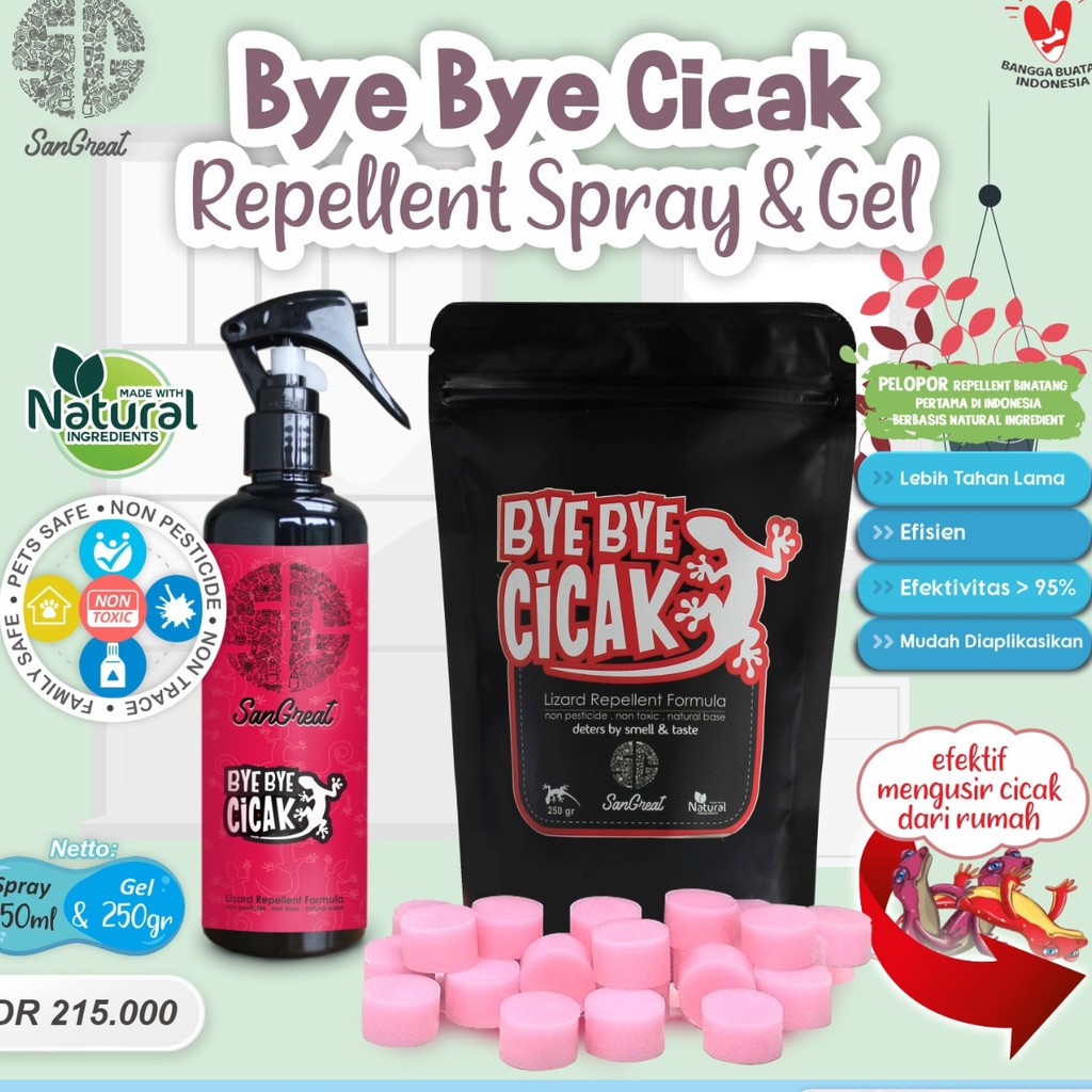 Deskripsi Paket Pengusir Cicak , Bye Bye Cicak Gel 250 gr dan Spray 250 grPAKET BYE BYE CICAK GEL DAN SPREYPengusir cicak alami non pestisida yang terdiri dariBB cicak gel 250 grBB cicak spray 250 mlDeskripsi produk :Bye Bye Cicak (BB cicak) adalah essensial oil yang diformulasikan khusus sebagai repellent cicak.Sebagian besar cicak tidak suka wangi Bye Bye Cicak. Sehingga cicak tidak akan mendekat ke tempat yg tercium wangi Bye Bye Cicak.Bye Bye Cicak bukan racun sehingga tidak akan membuat cicak mati.Berfungsi sebagai repellent. Penolak cicak.Fungsi BB CicakMemecah teritori cicakMencegah cicak mendekati atau memasuki areal tertentu (cicak repellent)Cara pakai:Bye Bye Cicak Gel1. Bersihkan area rumah dari bekas kotoran cicak dan barang-barang yang mudah dijadikan sarang cicak.2. Sebarkan beberapa gel Bye Bye cicak ke tempat yang diperlukan dengan jarak 5-10 cm seperti di atas lemari, meja makan, lemari makan, dll.3. Sesuaikan jumlah gel yang disebar dengan luas area, semakin banyak gel yang disebar akan semakin efektif.4.Gel Bye Bye Cicak akan mengering setelah 4-5 hari.5. Untuk memberikan efek yang lama, gel Bye Bye Cicak dapat disebarkan kembali setelah gel sebelumnya mengering.6. Sebarkan Bye Bye Cicak secara reguler untuk memecah teritori cicakBye Bye Cicak Spray1. Semprotkan Bye Bye Cicak spray ke tempat yang sering dilalui cicak atau persembunyian cicak2. Sebaiknya disemprotkan menjelang malam, saat cicak beraktifitas.2.semakin sering disemprot pada area yg sering dilalui cicak atau persembunyian cicak semakin membuat cicak enggan lagi bersembunyi di area tersebutWarning: efek Bye Bye Cicak mungkin tidak sama untuk setiap cicak.Reseller are welcome#byebyecicak#cicakrepellent#pengusircicak#lizardrepellent#usircicak#anti