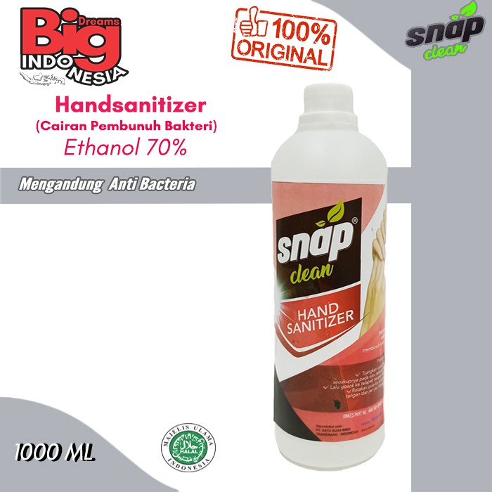 PRODUK SELALU READY, LANGSUNG AJA DIORDER KAKA :DPENTING!INFO JAM PENGIRIMAN :INSTAN SAMPAI JAM 4 SORESAMEDAY SAMPAI JAM 3 SOREPENGIRIMAN SENIN SAMPAI SABTU (MINGGU / TANGGAL MERAH LIBUR)[Peraturan Order]Dikarenakan peraturan order pihak layanan online delivery GOJEK DAN GRAB yang melakukan pembatasan berat dan ukuran pada setiap pengiriman maka kami PIHAK SELLER hanya bisa melakukan pengiriman sebagai berikut :Gojek dan Grab Layanan Instant Delivery : Maksimal 18 Galon .Gojek dan Grab Layanan Sameday Delivery : Maksimal 6 Galon.Bila pesanan melebihi Peraturan Order diatas kami akan tetap mengirimkan pesanan pembeli dengan batas maksimal dan sisa uang pembeli akan di kembalikan. Terima Kasih[Deksripsi Produk]HANDSANITIZER SNAP CLEANHand Sanitizer adalah cairan pembunuh kuman dan bakteri yg terbuat dari komposisi 70% alkohol didalamnya.Sertifikasi :1. IJIN DINKES PKRT NO : 440/001-SPKRT/DPMTSP/0L/20182. MSDS (Sertifikat Keselamatan)3. Halal4. SUCOFINDOSpesifikasi :1. 1 Liter / GALON2. Handsanitizer Berbentuk