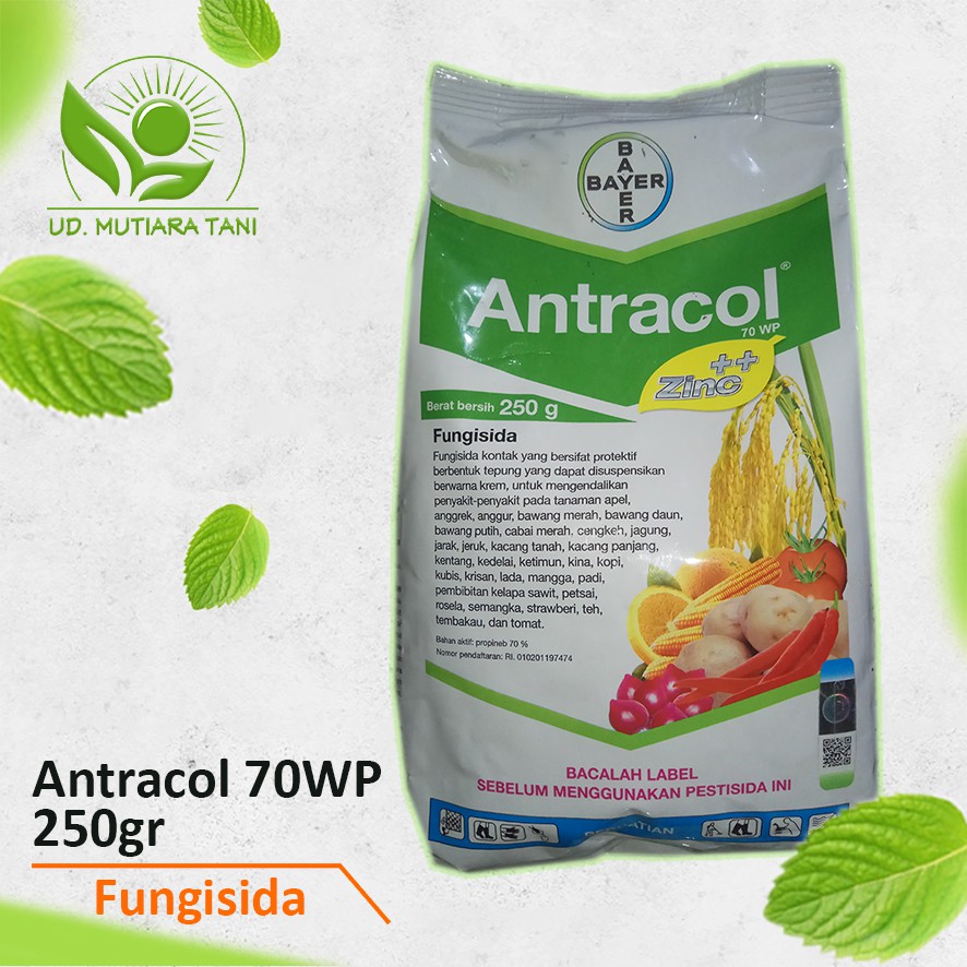 Spesifikasi Antracol 70WP Merk dagang : Antracol 70WPJenis : FungisidaBahan aktif : Propinep 70%Formulasi : WP (Wattable Powder)Warna : Krem/putih kekuninganCara kerja : KontakBentuk fisik : TepungProdusen : PT. Bayer IndonesiaDosis & Cara Penggunaan:1. Dosis disesuaikan dgn usia tanaman & jenis tanaman, lihat pd kemasan2. Fungisida Antracol 70WP dilarutkan dgn air, diaduk hingga produk tercampur rata3. Gunakan sprayer utk menyemprotkan larutan fungisida ketanaman4. Tambahkan perekat, pembasah & perata jika diperlukan5. Supaya lbh efektif sebaiknya penyemprotan dilakukan sejak dini6. Penyemprotan sebaiknya dilakukan pd pagi hari & sore hariKelebihan Fungisida Antracol 70WP1. Fungisida bekerja secara kontak langsung yaitu fungisida akan langsung bekerja ketika larutanyg disemprotkan bersentuhan dgn tanaman yg terinfeksi2. Antracol 70WP berbentuk tepung dpt disuspensikan dgn air & larut dgn segera sehinggapenggunaannya lbh mudah & praktis3. Dpt digunakan pd segala musim, baik musim kemarau maupun musim hujan4. Dpt digunakan utk mengendalikan penyakit jamur pd banyak jenis tanaman5. Fungisida Antracol 70WP bersifat racun kontak& tdk dpt menembus jaringan tanaman sehinggaresidu lbh r