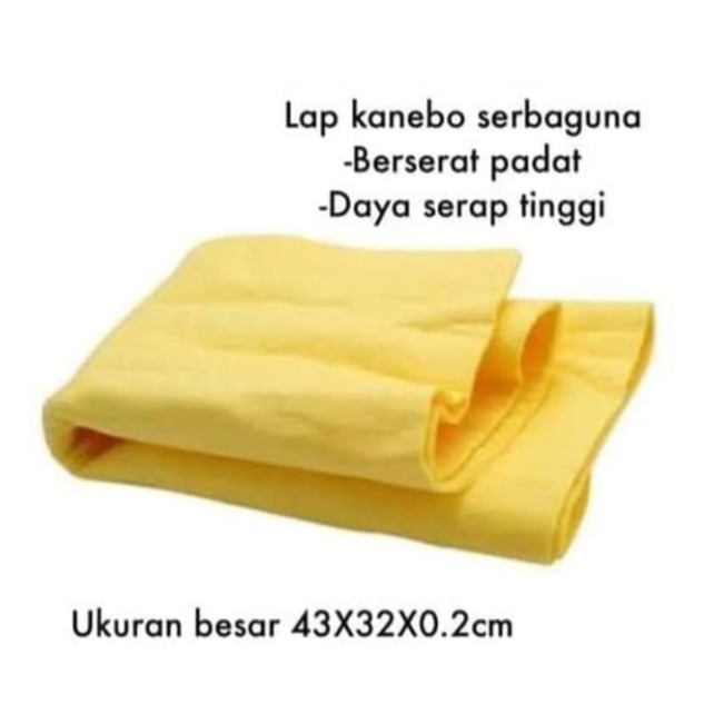 Warna : KuningDeskripsi Lap Kanebo Chamois Besar untuk Mobil MotorLap Kanebo Jumbo Merupakan lap pembersih serbaguna yang terbuat dari materialterbaik, berkualitas recommended untuk detailing, halus, lembut, tidak menggoresdan mampu mengangkat kotoran dengan baik. Lap ini dapat digunakan pada kendaraanataupun pada perabotan rumah tangga Anda. Cukup rendam produk ini di dalam airhangat hingg lap menjadi lemas. Dengan permukaan yang halus produk ini memilikidaya serap yang sangat tinggi sehingga cocok digunakan untuk mobil, kaca dan banmobil Anda.Deskripsi produk :- Plas Chamois- Daya Serap Tinggi- Mudah untuk digunakan- Mudah untuk membersihkan noda/debu- Ukuran 43cm x 32cm (Besar)- ketebalan 0.2cm