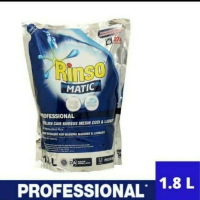 Rinso Detergent Liquid Professional Matic 1.8ltDeterjen dalam bentuk cair yang diformulasikan khusus untuk mesin cuci professional yang efektif mengangkat kotoran dan noda bandel dengan busa yang lebh sedikit dengan pemakaian air yang lebih efektif. Deterjen ini memiliki nilai plus menjaga mesin cuci lebih awet.CARA PEMAKAIAN RINSO MATIC LIQUIDGunakan : 1 TUTUP BOTOL = 65 mlCukup untuk mencuci hingga 5kg pakaian = 25 pakaian**Tergantung pada jenis pakaian dan kondisi pencucian. Untuk noda membandel, oleskan Rinso Matic cair pada noda, gosok sebentar dan masukkan ke dalam mesin cuci.4 keunggulan Rinso Matic Pro:1. Efektif angkat noda bandel, masukkan saja deterjen sesuai takaran ke dalam mesin cuci.2. Formulasi didesain khusus untuk mesin cuci sehingga menjaga mesin tetap awet.3. Mengandung surfaktan ramah lingkungan. Kadar busa disesuaikan untuk penggunaan dengan mesin cuci laundry professional dan laundry kiloan.Bisa semua All merk mesin Cuci Bukaan Atas dan Depan so jgn kuatir mesin cucinya ga